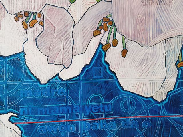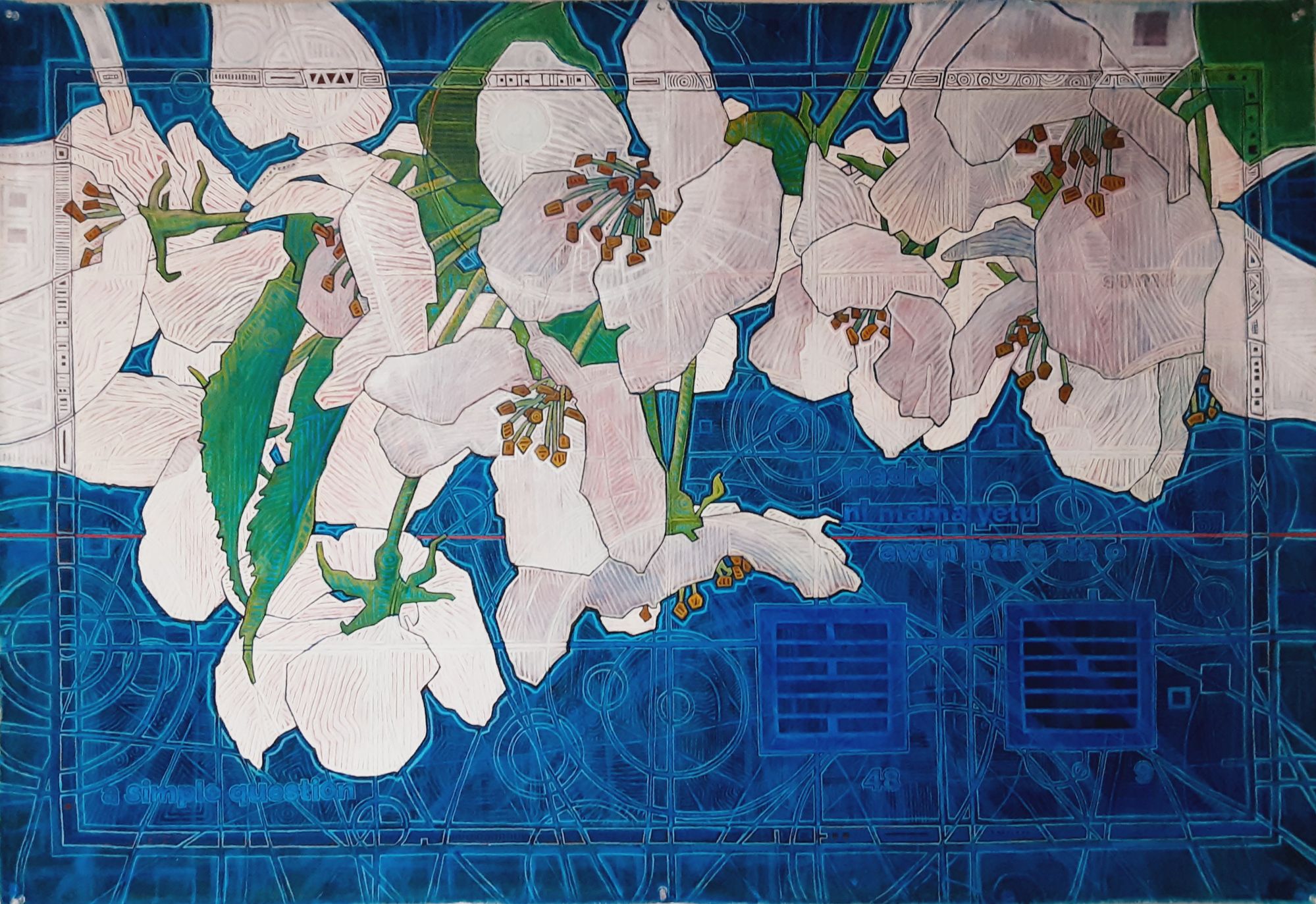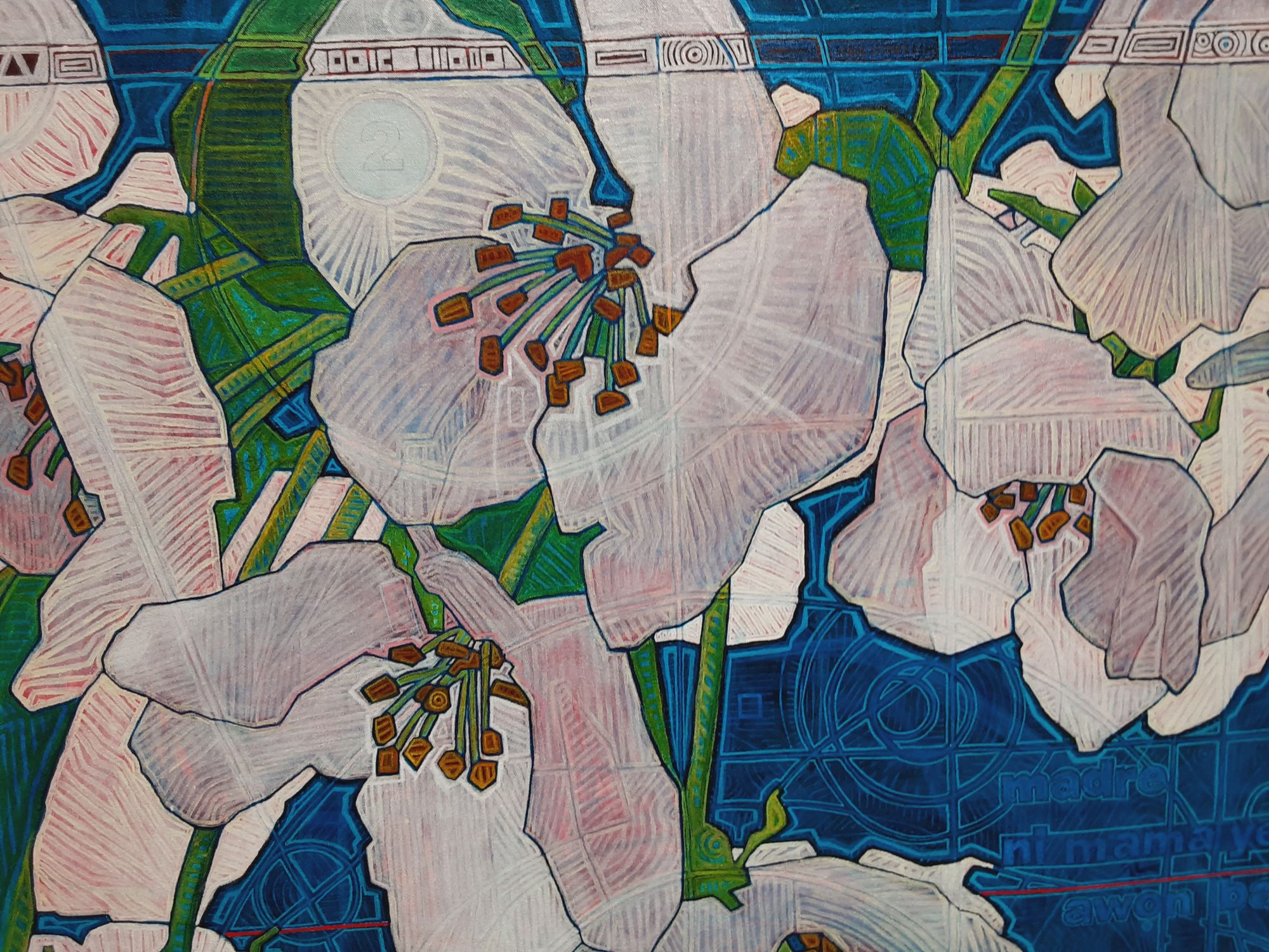 Years ago (decades actually), we were walking along a dirt road outside of Santa Fe, New Mexico, and an apple tree in bloom was lit so beautifully by the early morning sun. I took some photos to try to remember that light, and this painting became of that memory and those photos. The quotes are in Yoruba, Swahili and Spanish, and reference our connections to our mothers, and all our ancestors. There are also references to the I Ching, an ancient method of divination/wisdom seeking which is related to Taoism and Confucianism.