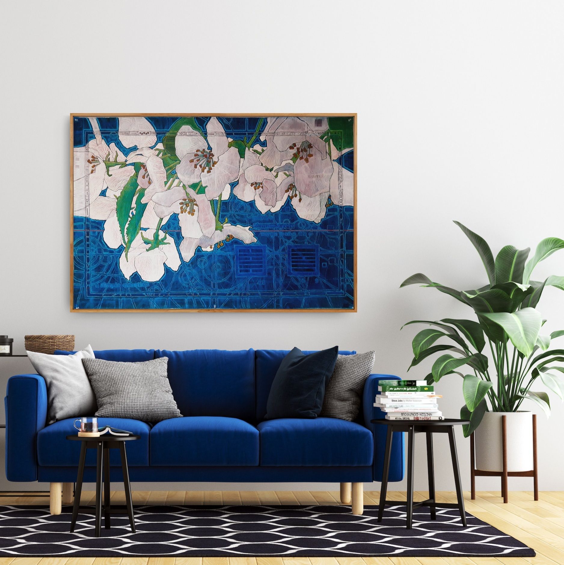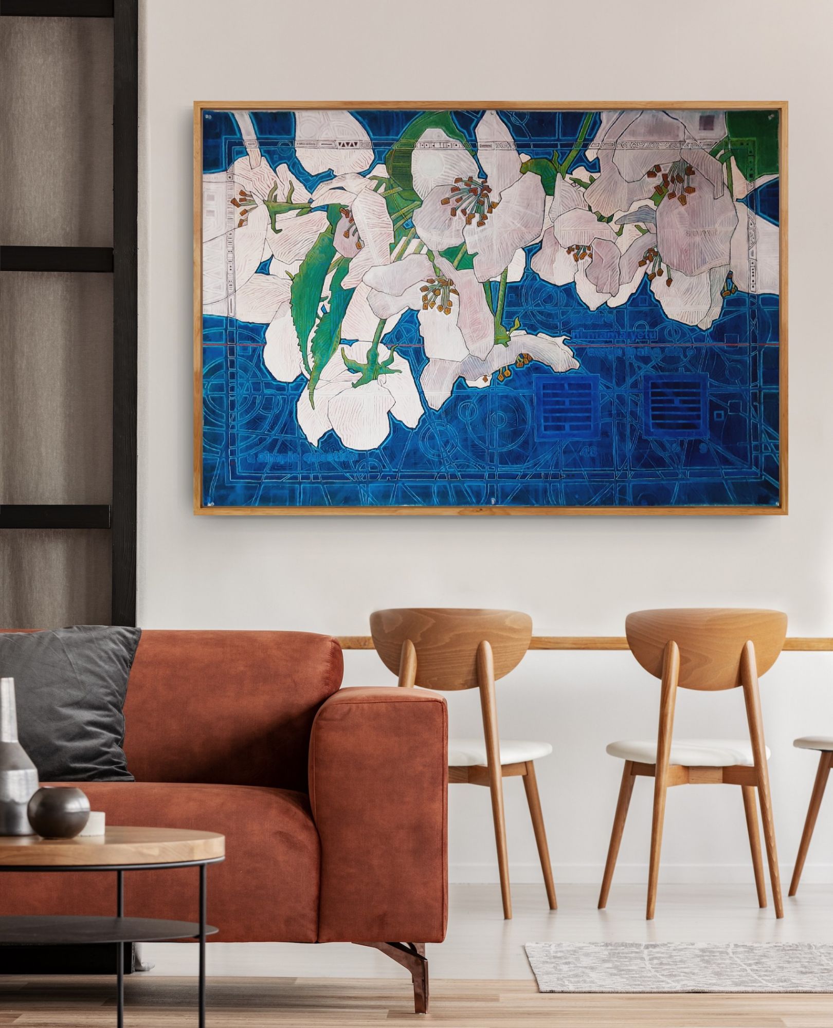 Below are some detail photos of the painting and photos of the painting in rooms as a reference.