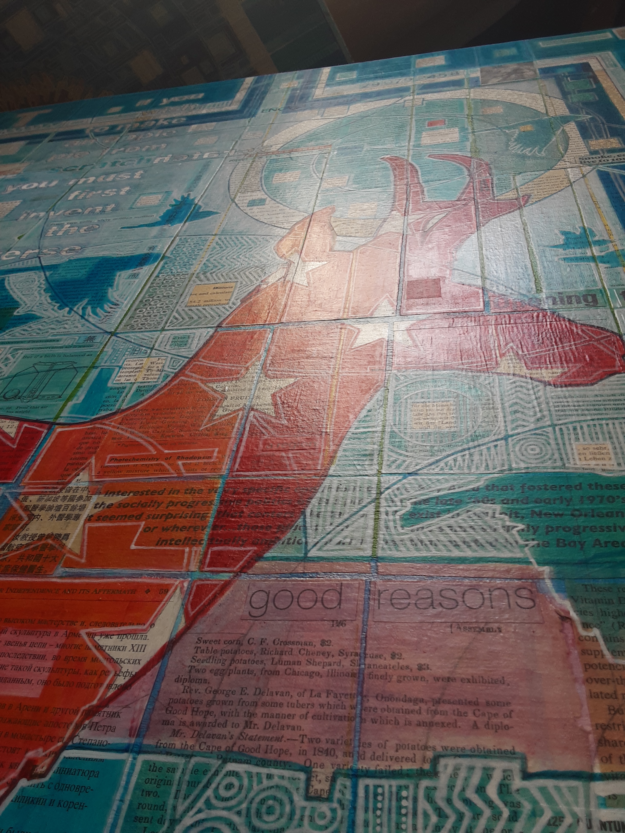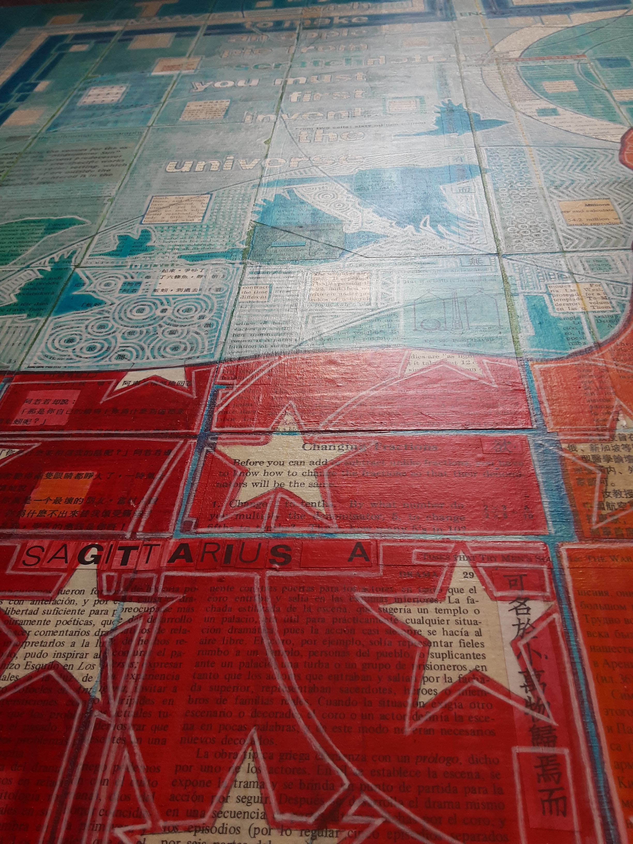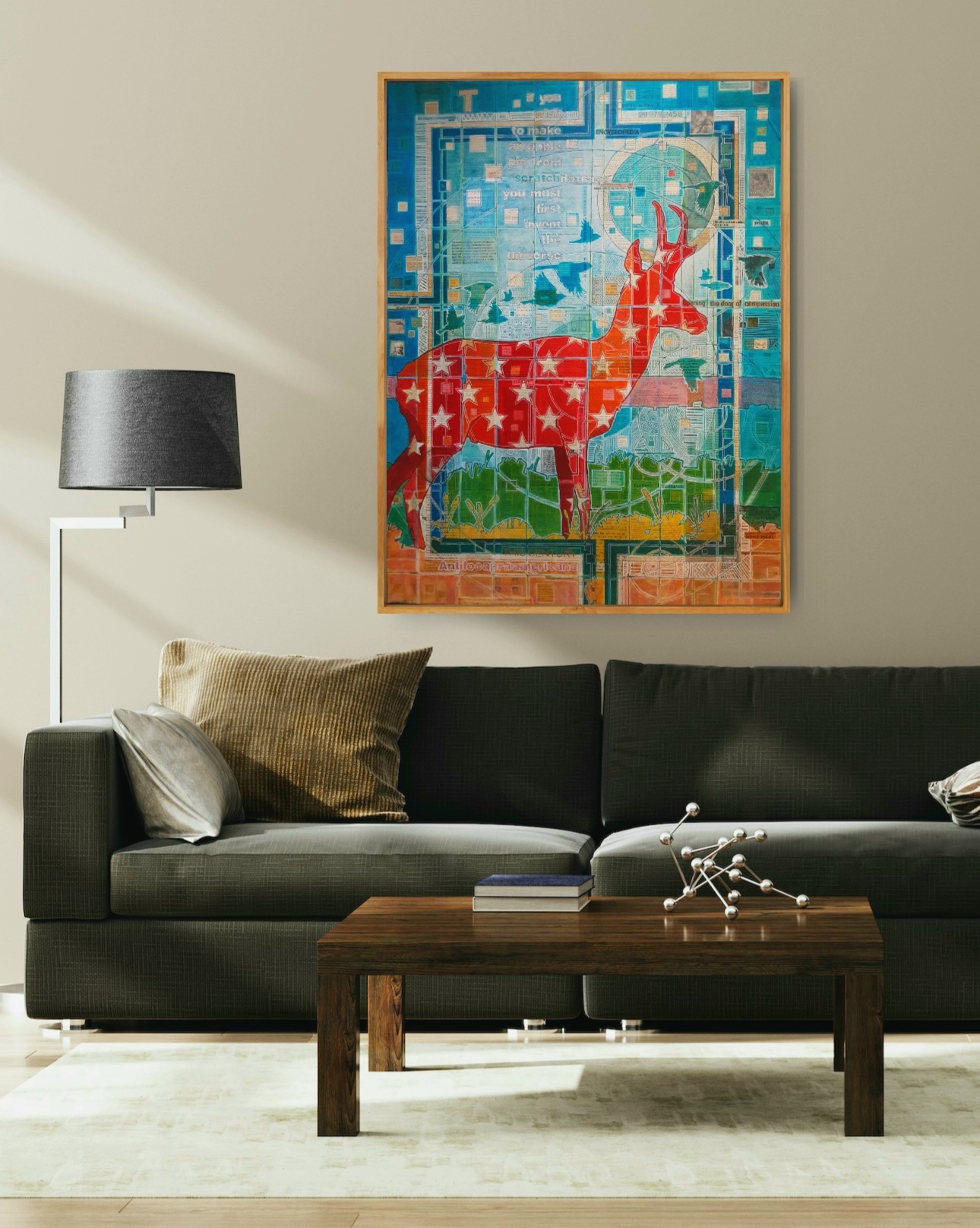 Pronghorn have always been a source of interest for me. They are just a little odd and very beautiful. They have always been symbolic for me of my childhood in Wyoming: I remember watching them running alongside the highway before I had the ability to describe them, so here I was exploring doing that with paint. The quote is by Carl Sagan, who was extremely influential upon me when I was young. His ability to inspire wonder in me at the amazing marvel of the universe has stayed with me my entire life, as well as his courage in speaking about the benefits of science and the dangers of superstition. The reference to 299,792,458 is the speed of light in meters per second (another homage to Carl Sagan and all of the astrophysicists out there trying to help us grasp the cosmos) and Sagittarius a is a reference to the black hole that exists at the center of the Milky Way galaxy, a source of unending mystery.