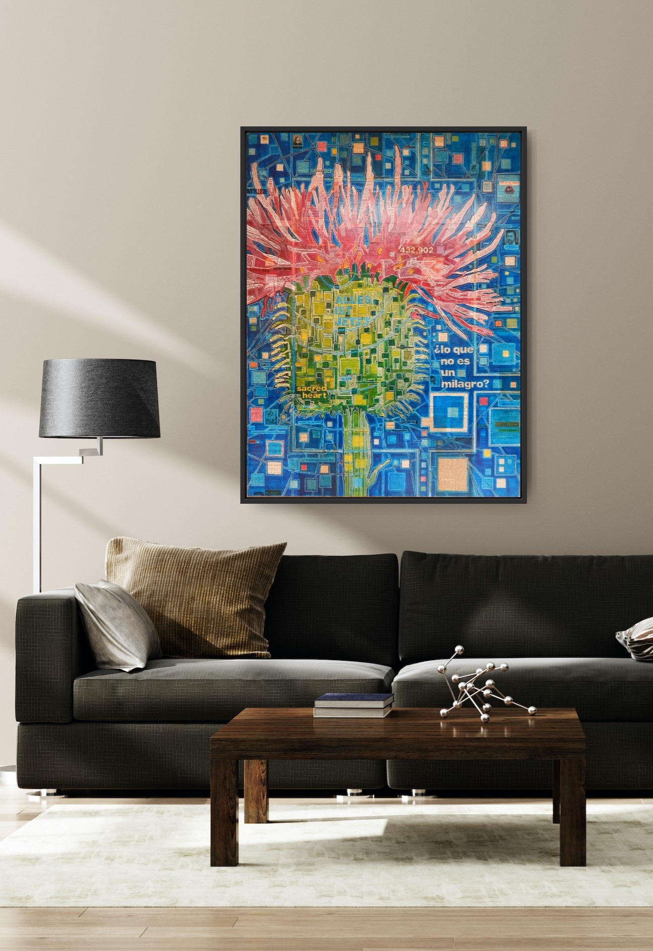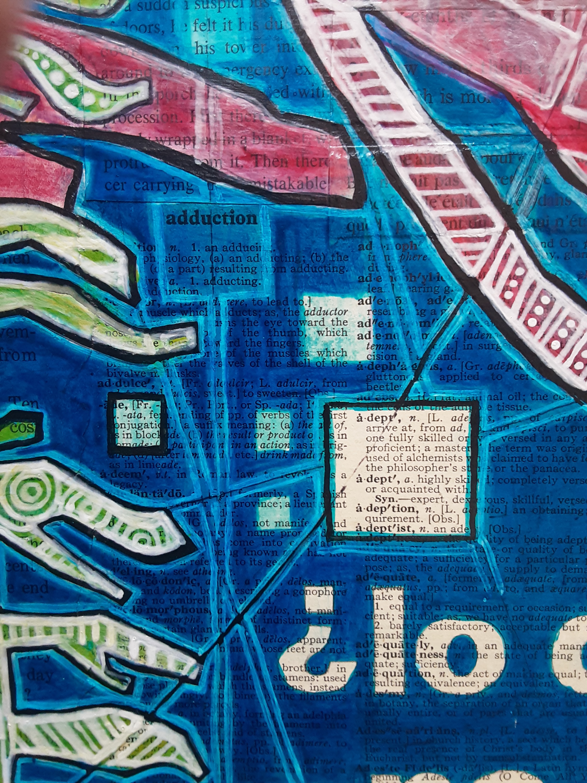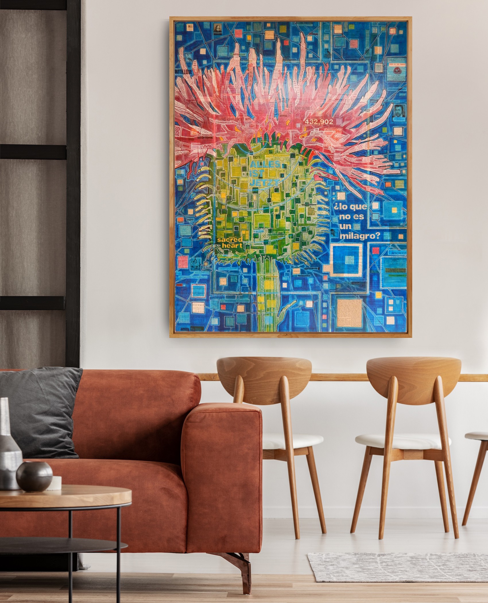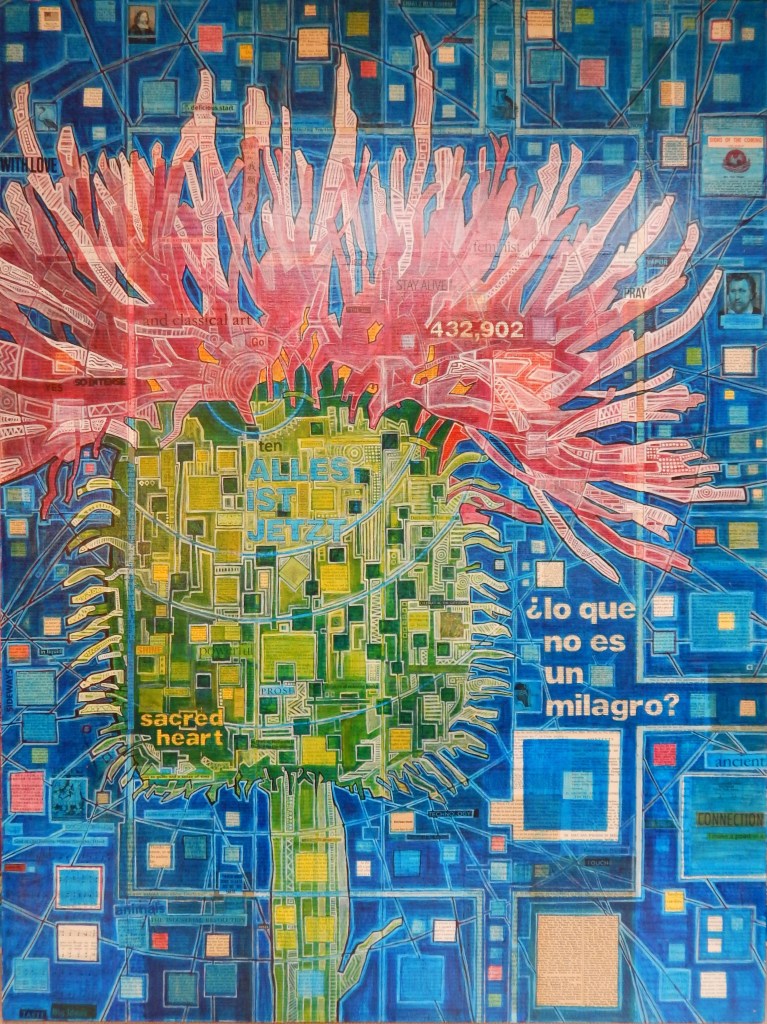Everything is now(Alles ist jetzt). Mixed-media painting of a blooming thistle, (acrylic, collage, graphite, ink and colored pencil), 36×48 inches, 91×122 cm. Cradled wood panel, unframed. Available for $5700. Please inquire about domestic or International shipping. Paintings are securely packed and crated for shipment and insured.